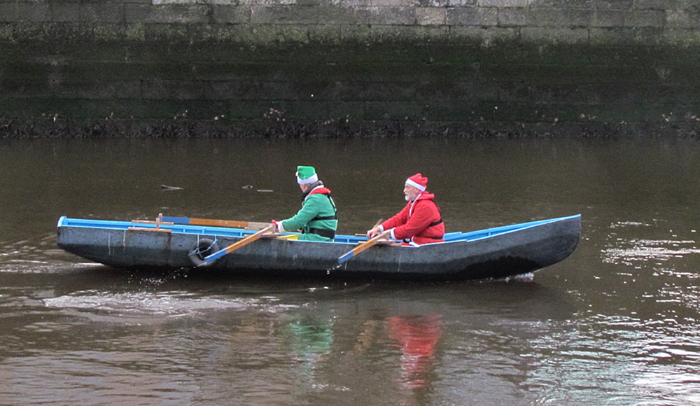 Anyway, on the way to meet him I stopped to watch a cormorant flying up the river, and then spotted Santa and an elf in what looks quite like a currach. It's obvious that they're not used to rowing, though, and they certainly weren't going at any pace. We're used to seeing far more expert rowers racing along further up-river where all the rowing clubs are.