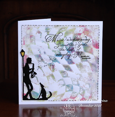 The busker with his dog was cut from gorgeous black velvet, and in looking for a simple background, I thought that particular gel print looked a little longer a swirling pavement.